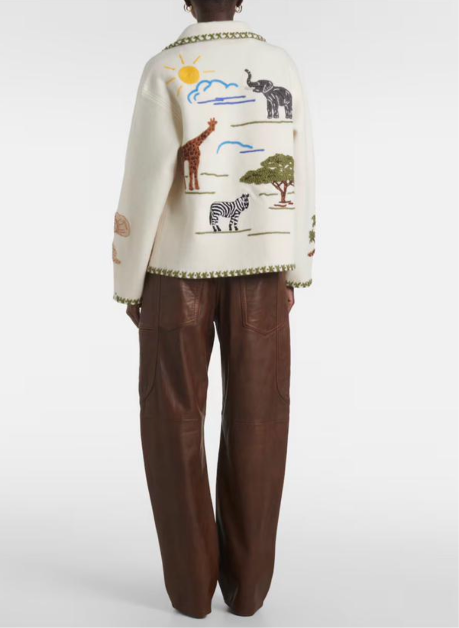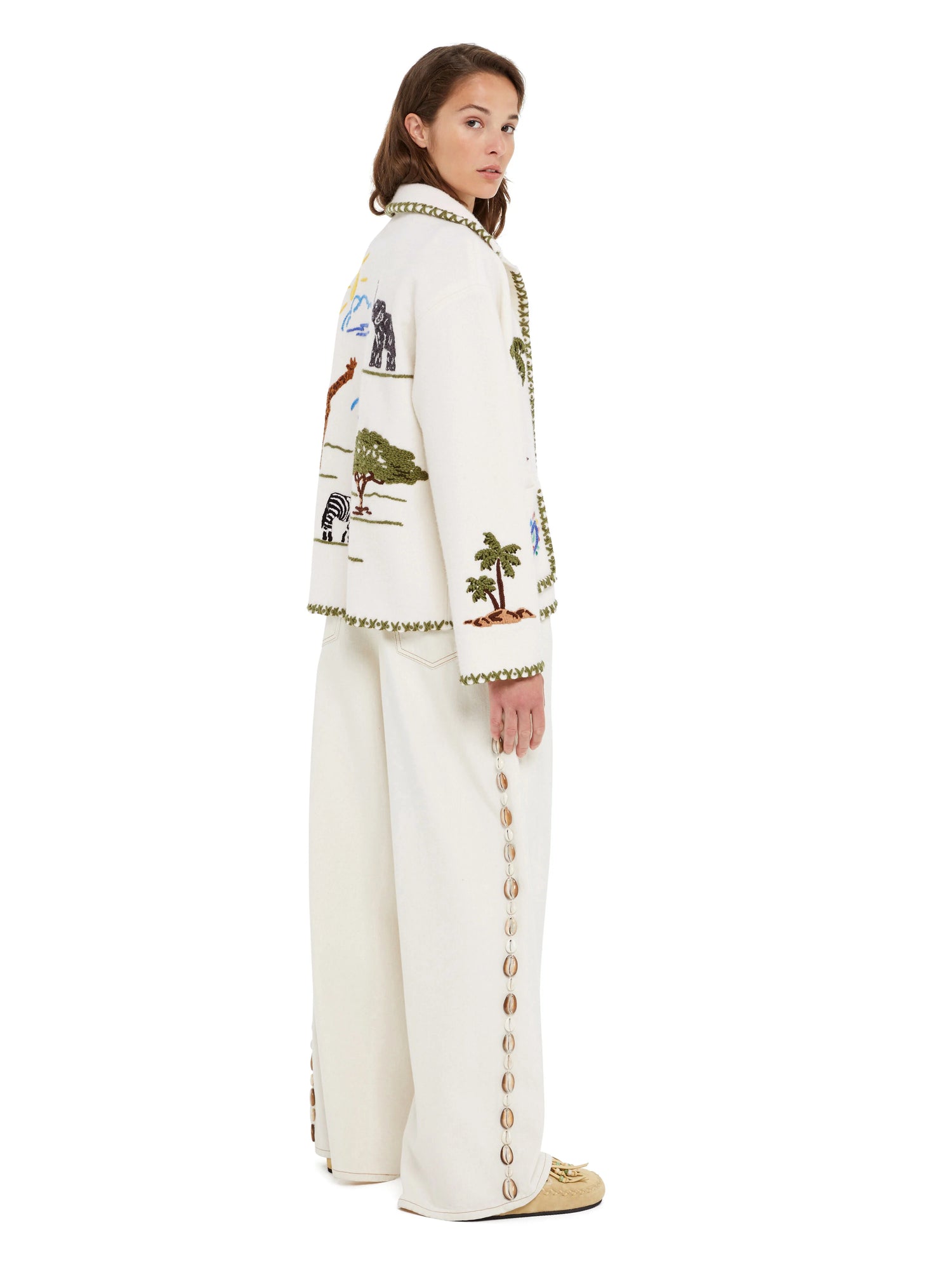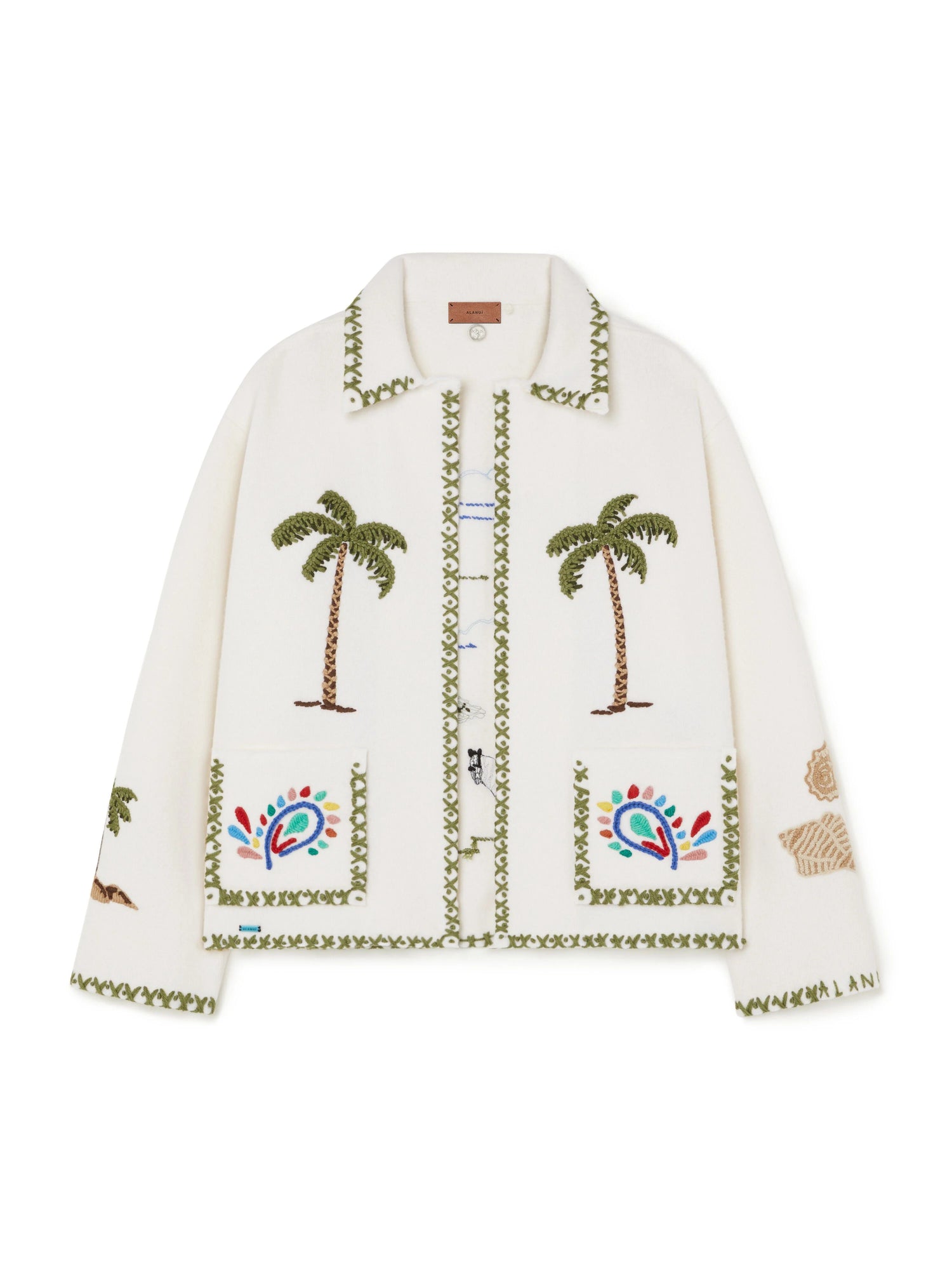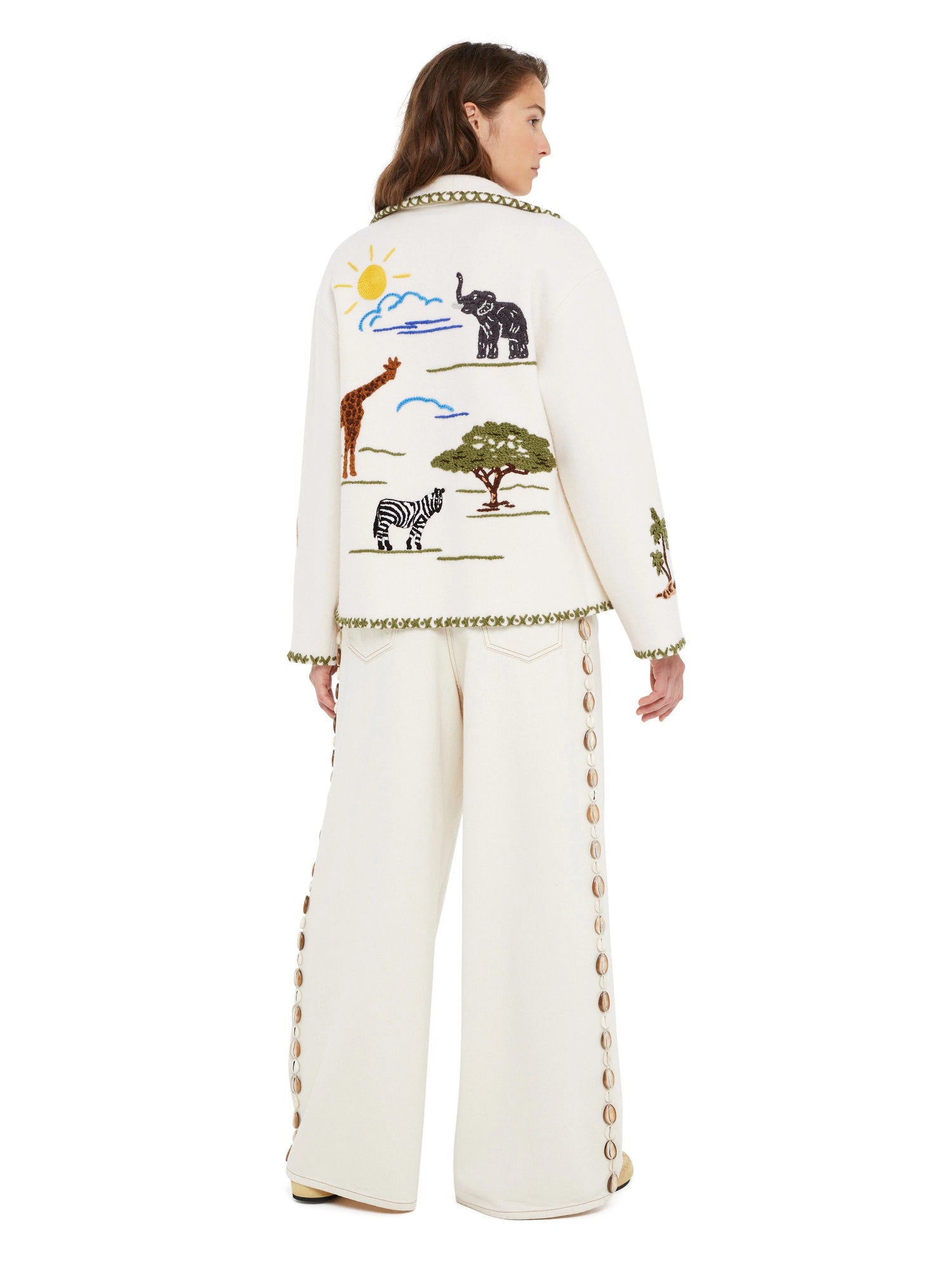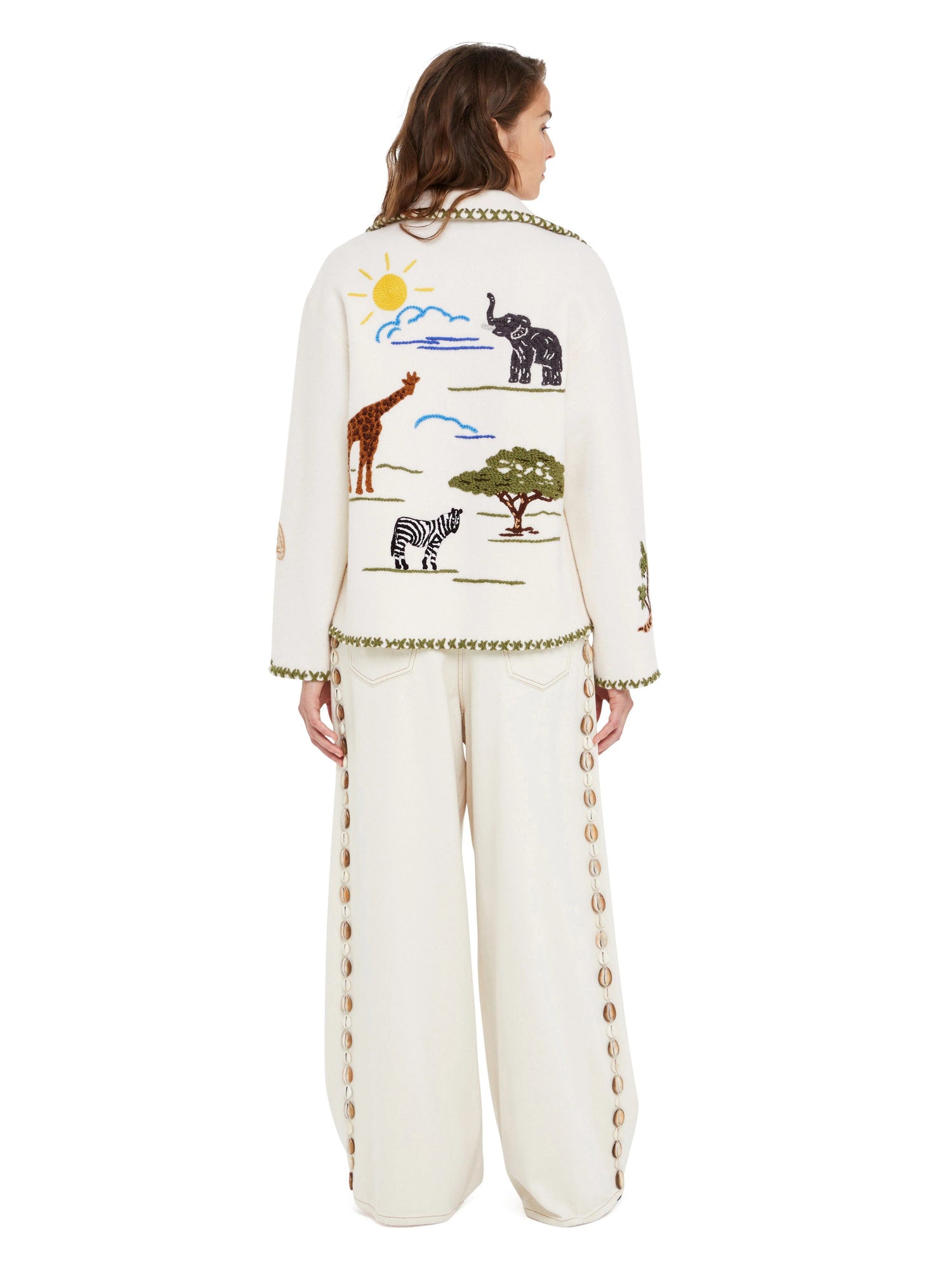 Alanui embarks on an unforgettable journey to the African continent this season. The ultimate souvenir de voyage, the Remember Me Jacket returns for Spring/Summer 2025 with a motif of palms, acacia trees and wild animals, hand-embroidered onto felted virgin wool. Featuring a boxy fit and hand-embroidered Alanui logo on the cuff.
