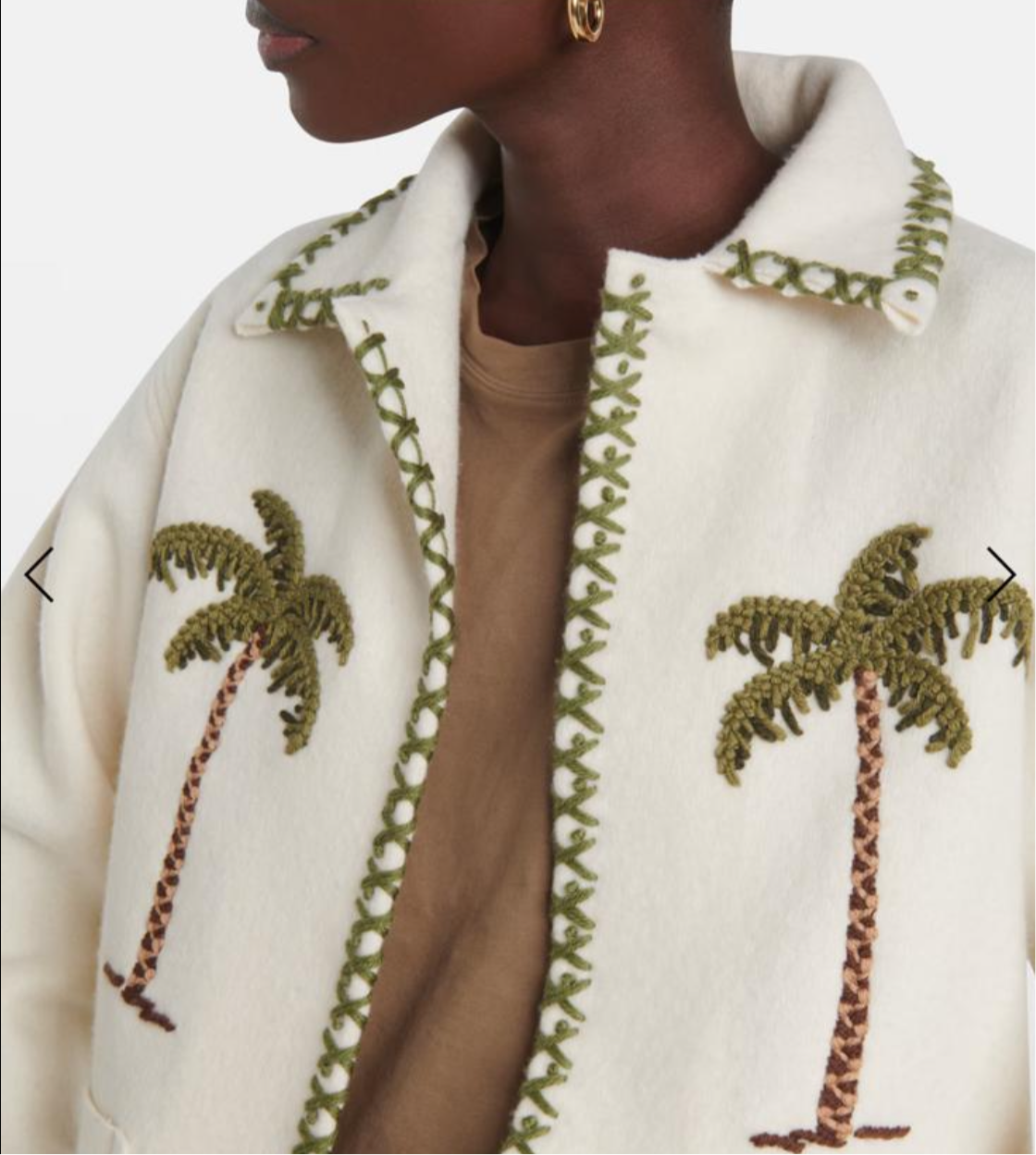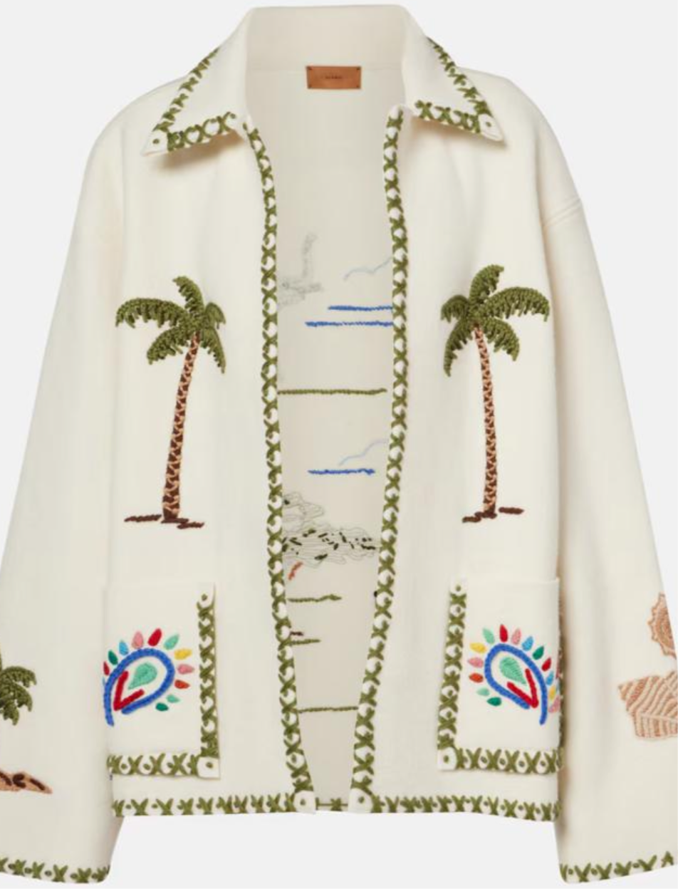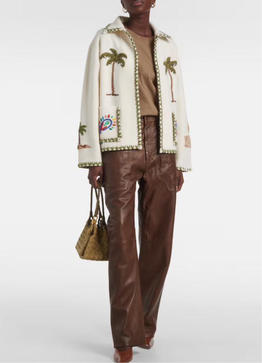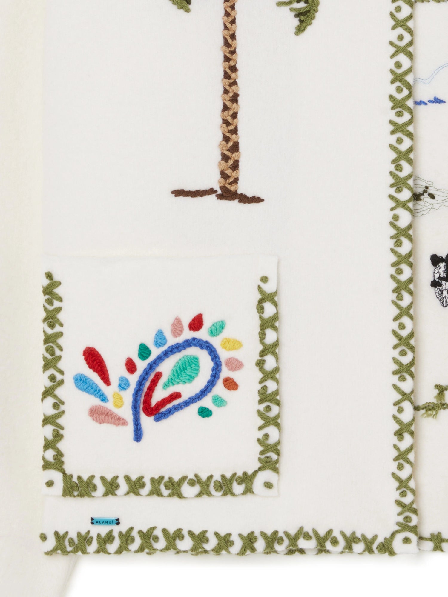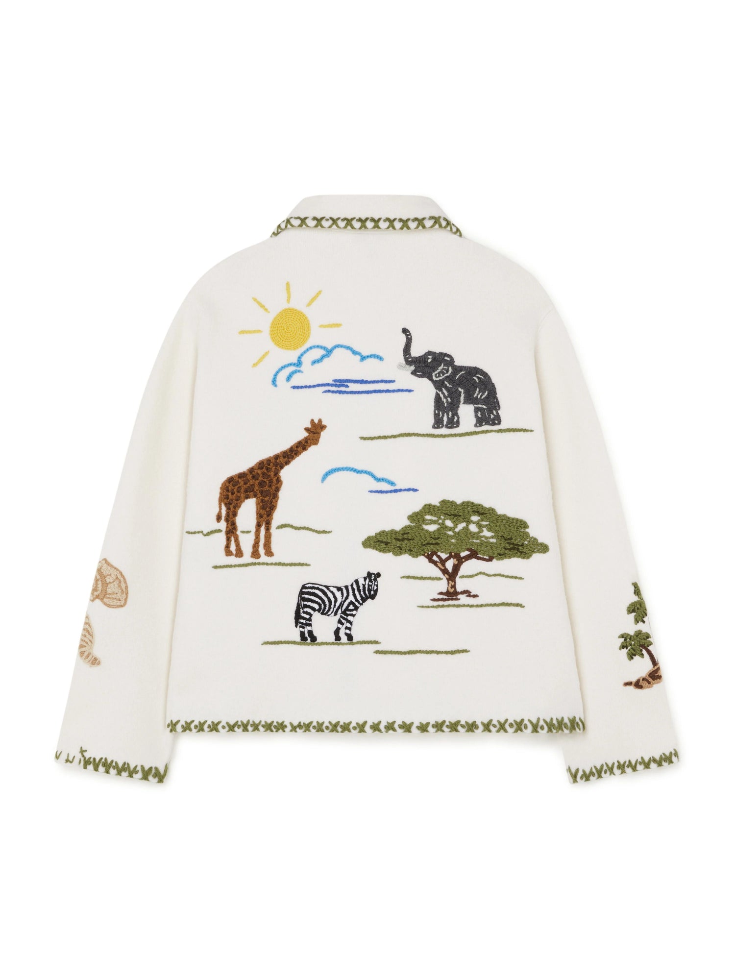 Alanui embarks on an unforgettable journey to the African continent this season. The ultimate souvenir de voyage, the Remember Me Jacket returns for Spring/Summer 2025 with a motif of palms, acacia trees and wild animals, hand-embroidered onto felted virgin wool. Featuring a boxy fit and hand-embroidered Alanui logo on the cuff.