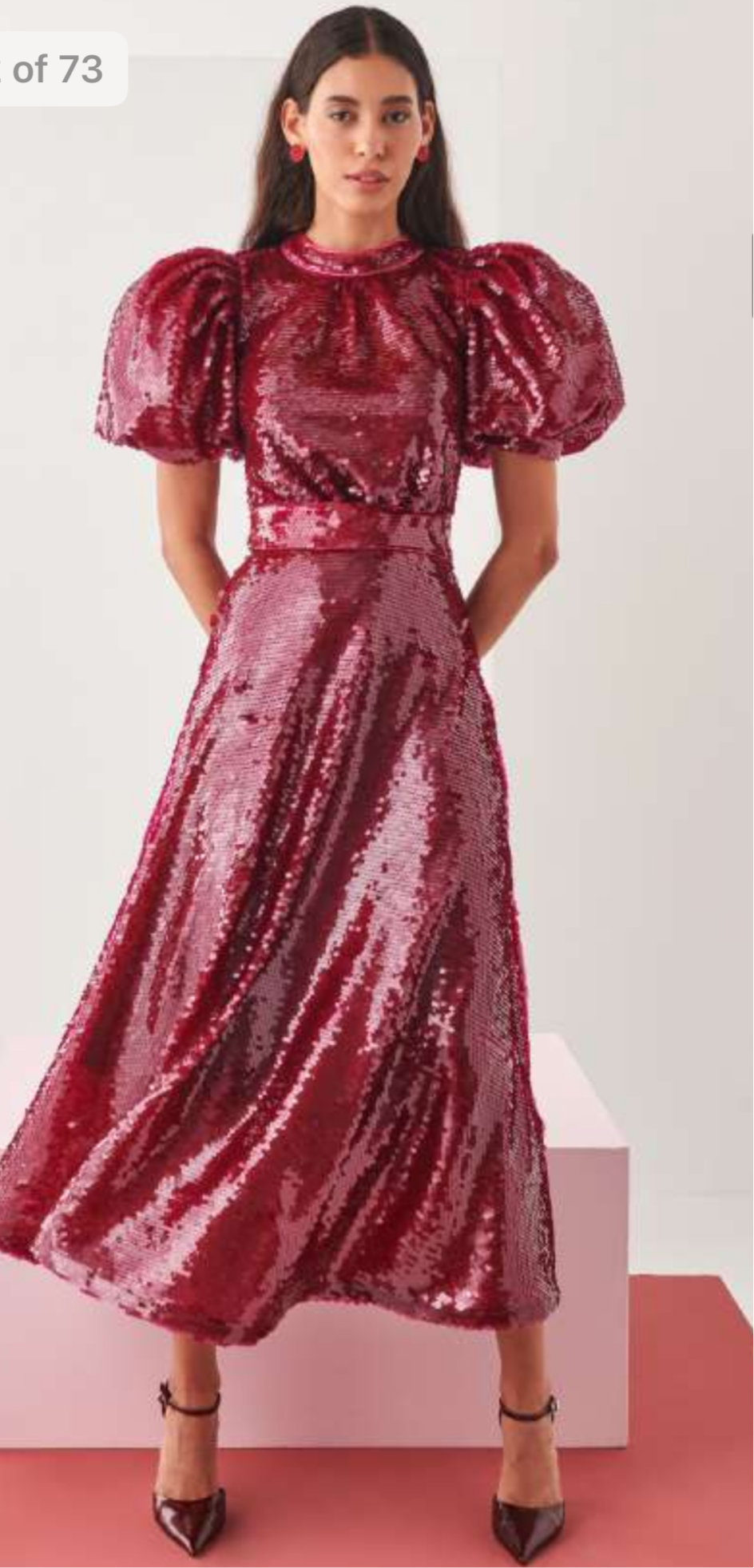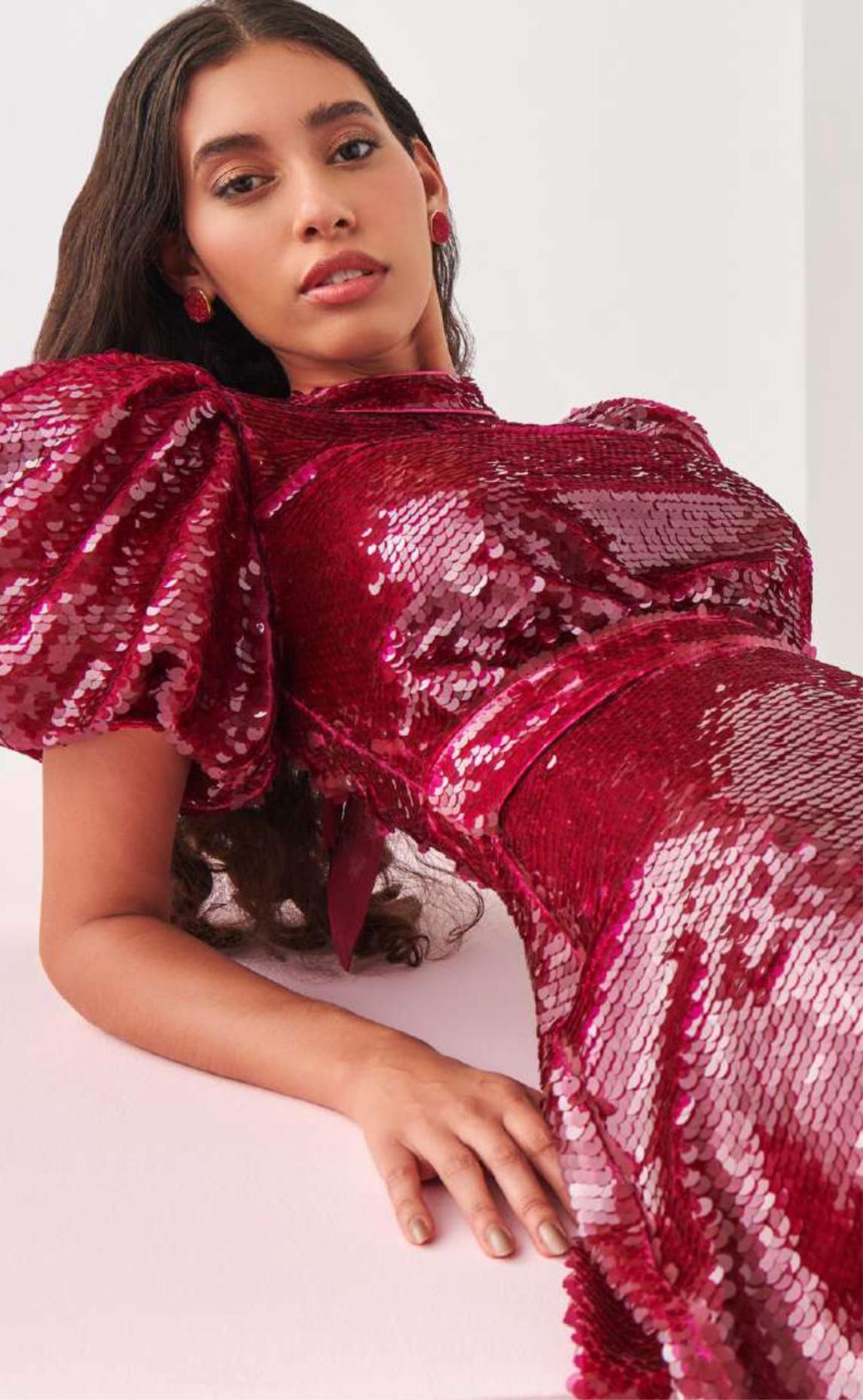 Another classic silhouette, the Seraph this time in sequined red. Designed with puffed statement sleeves and a fitted waist for the perfect silhouette. The shine and dark ruby tone make it ideal for evening parties! Closed with a zip on the back.