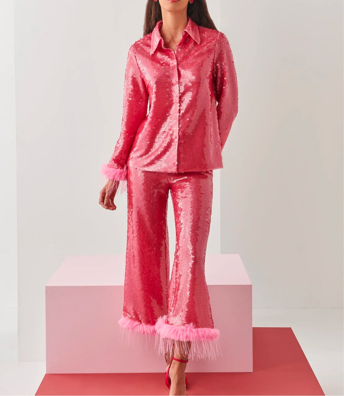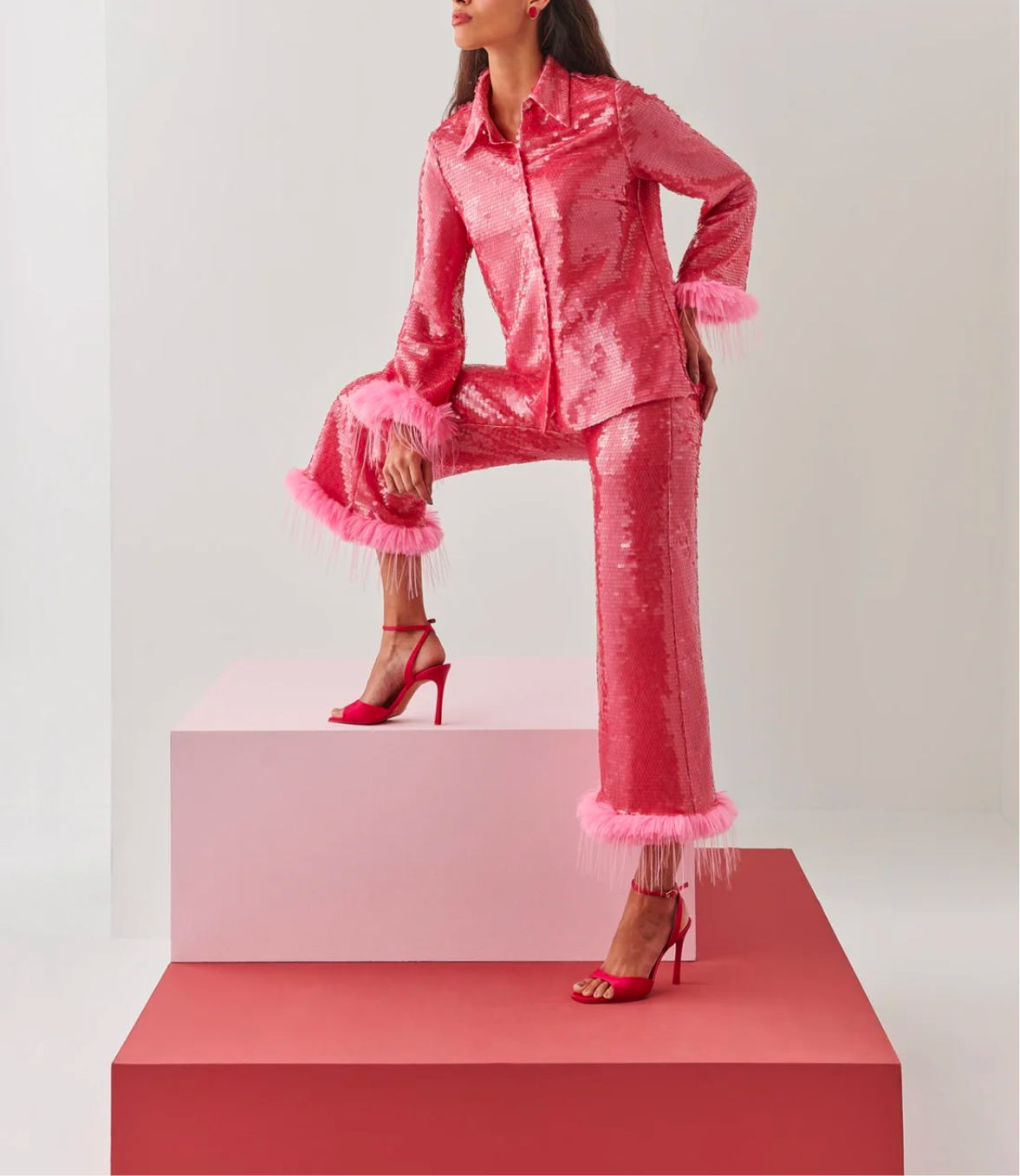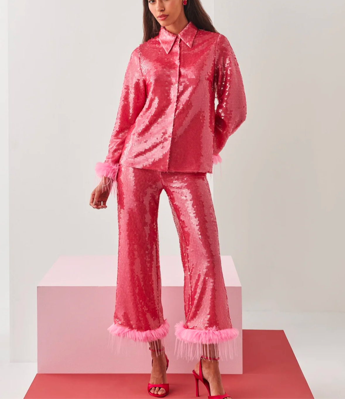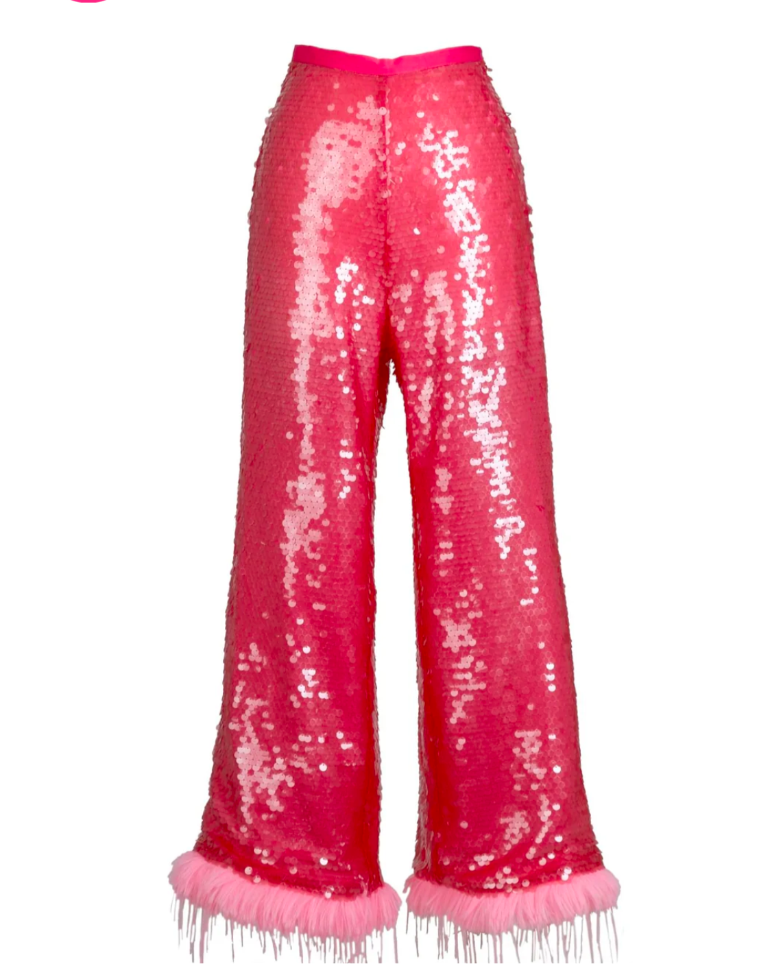 The OASIS pants are back - this time in hot pink sequins, complete with feather-trimmed hems for a touch of drama. Straight legged, designed for both comfort and impact, these pants pair seamlessly with the matching top or can be styled solo for a head-turning ensemble.