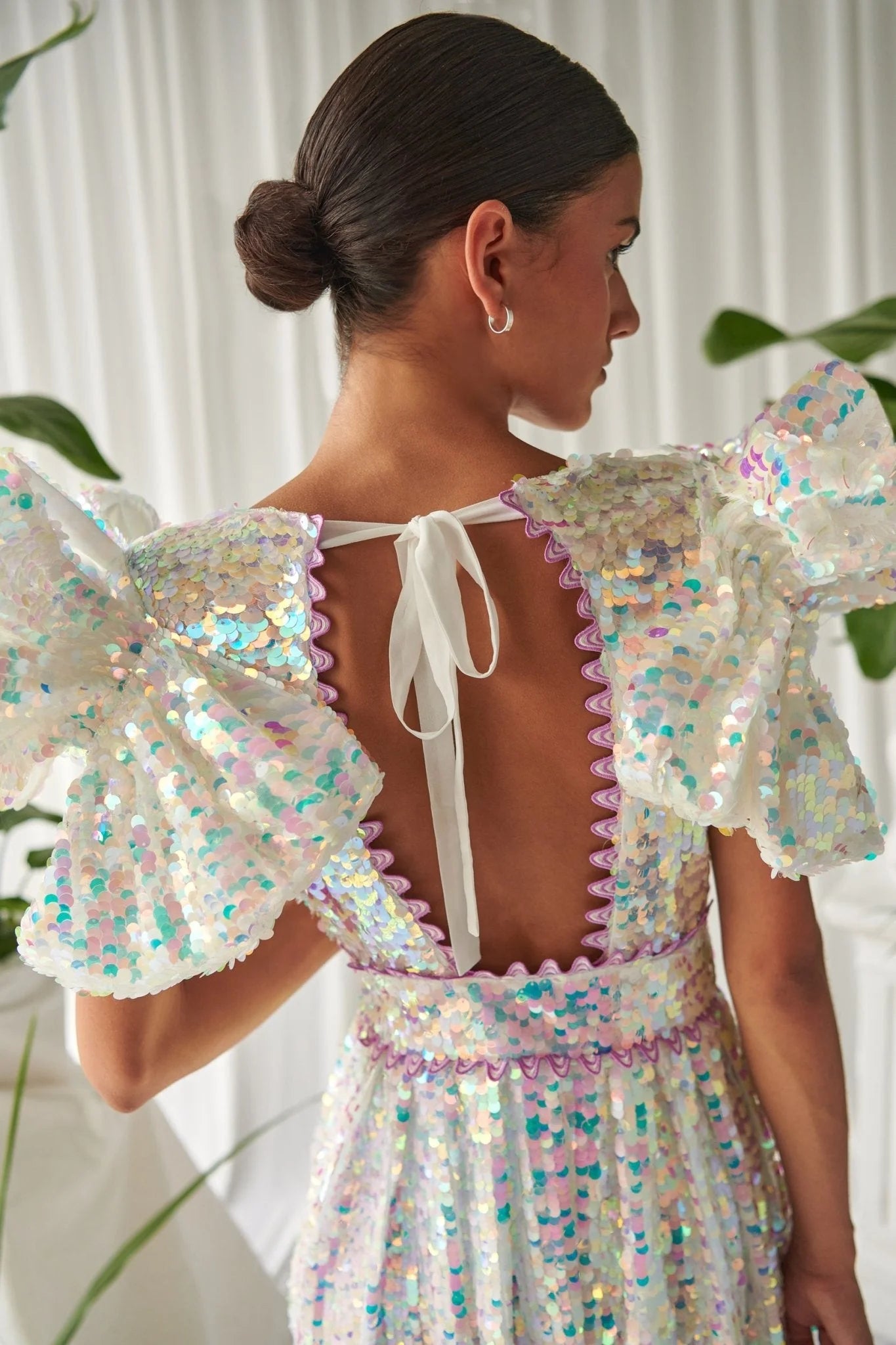 The Nevis dress is a stunning, white irridescent with pink scalloped edges. Featuring large sleeves, a deep v-neck and open back. Cinched belted waist, closed with a ribbon at the back, a side zipper and pockets. The Nevis is perfect for any formal setting!