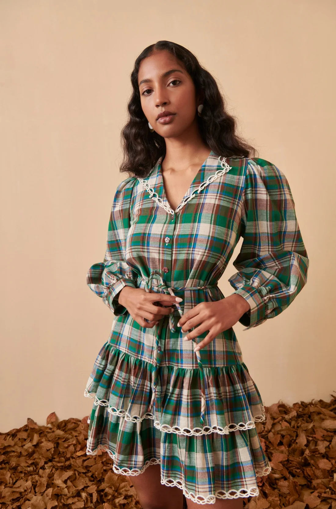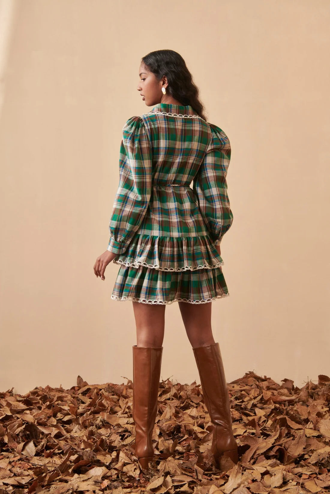 The Luar Dress combines rustic charm with playful femininity. Crafted in a green, brown, and cream plaid, it features a tiered mini silhouette with delicate white lace trim at the collar, hem, and tier seams. Long puff sleeves with buttoned cuffs balance the short length, while a drawstring waist allows for a customizable fit. Perfect with tall boots for a cozy yet polished winter look.