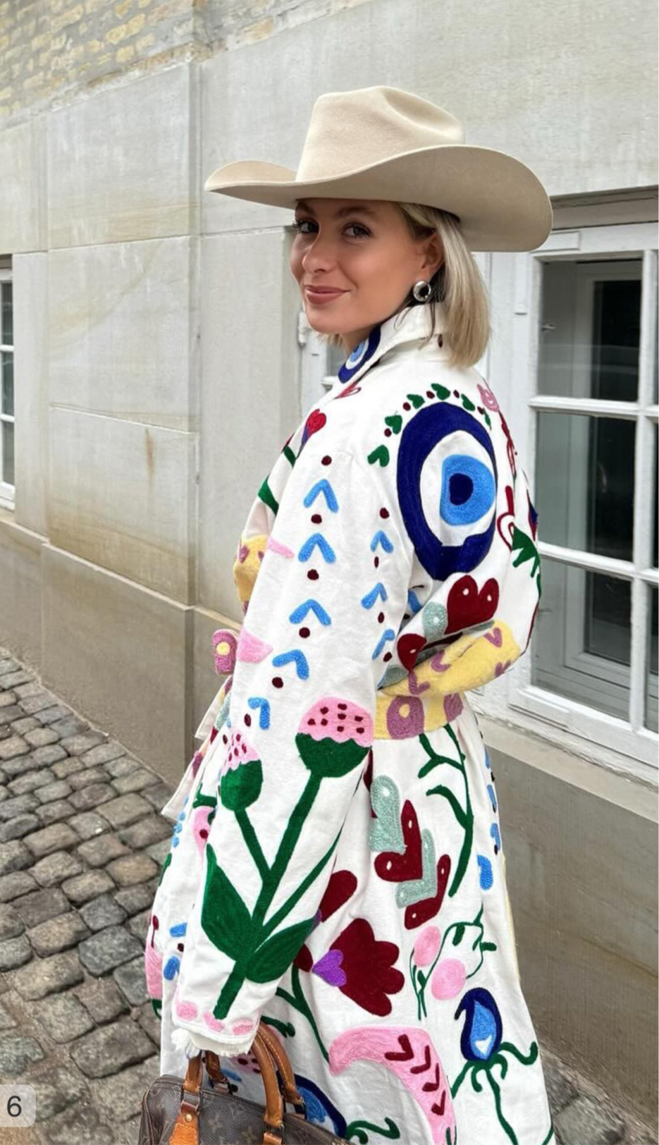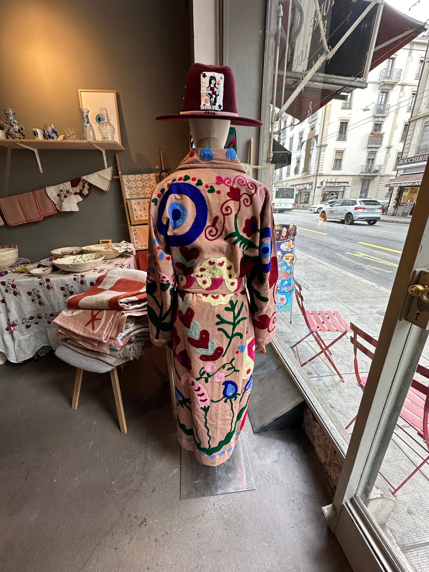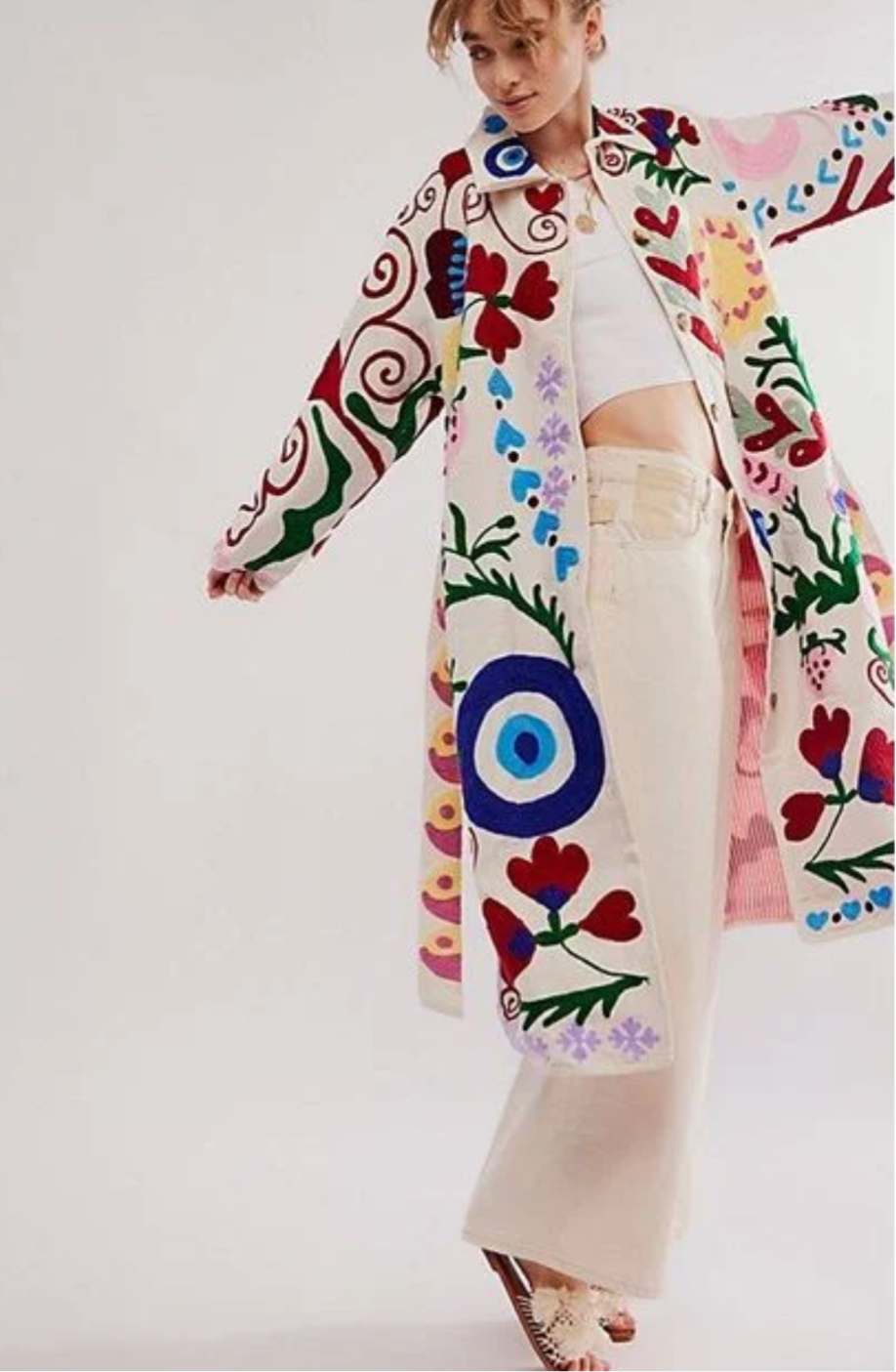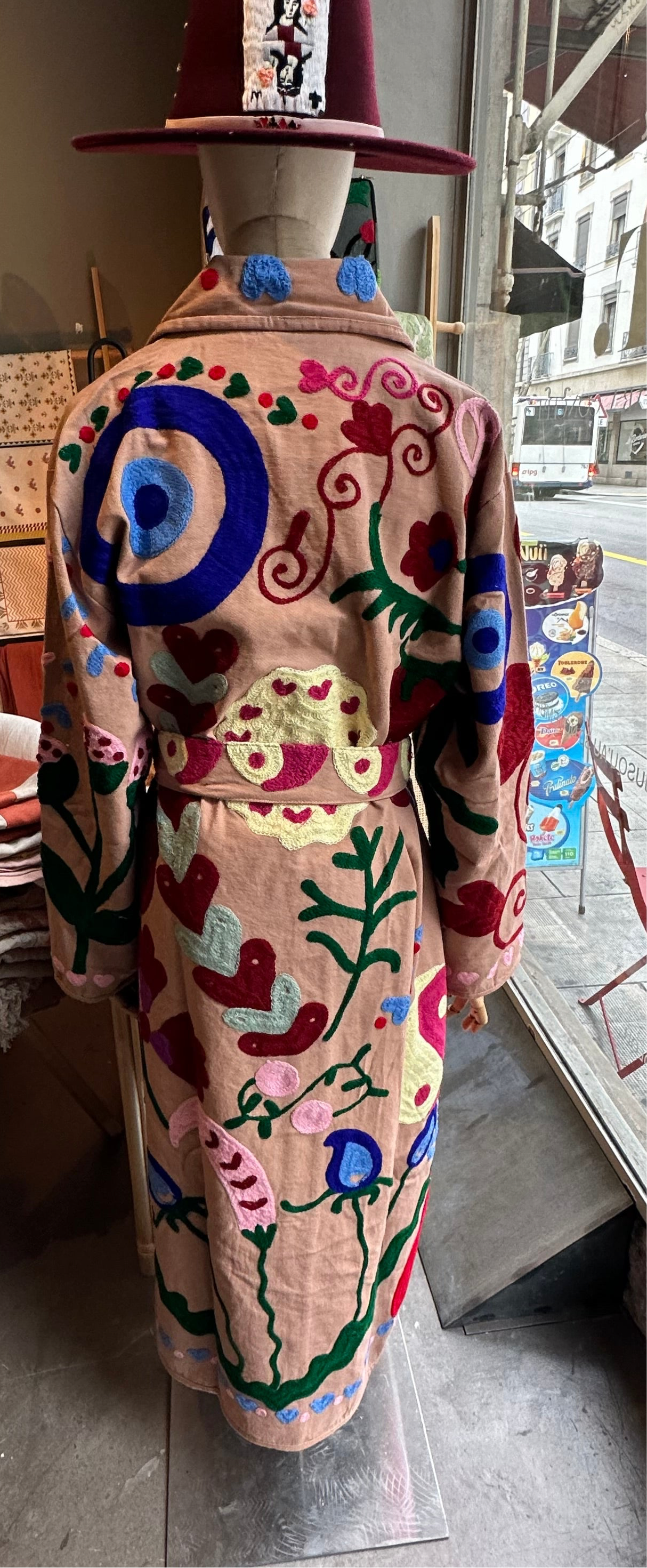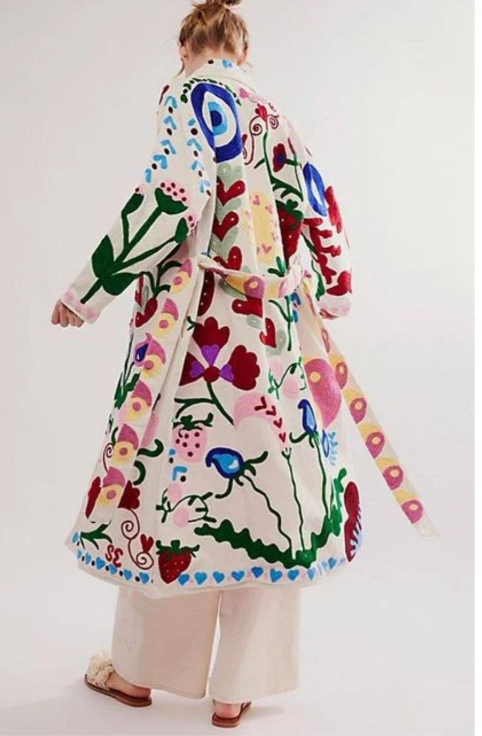 This coat iscotton canvas and made with eye-catching Suzani embroidery. The special designed artwork features poppy flowers, hearts, strawberries and a huge Yin and Yang symbol, that represent the interconnection of the natural world.