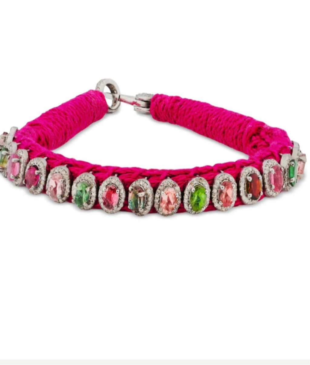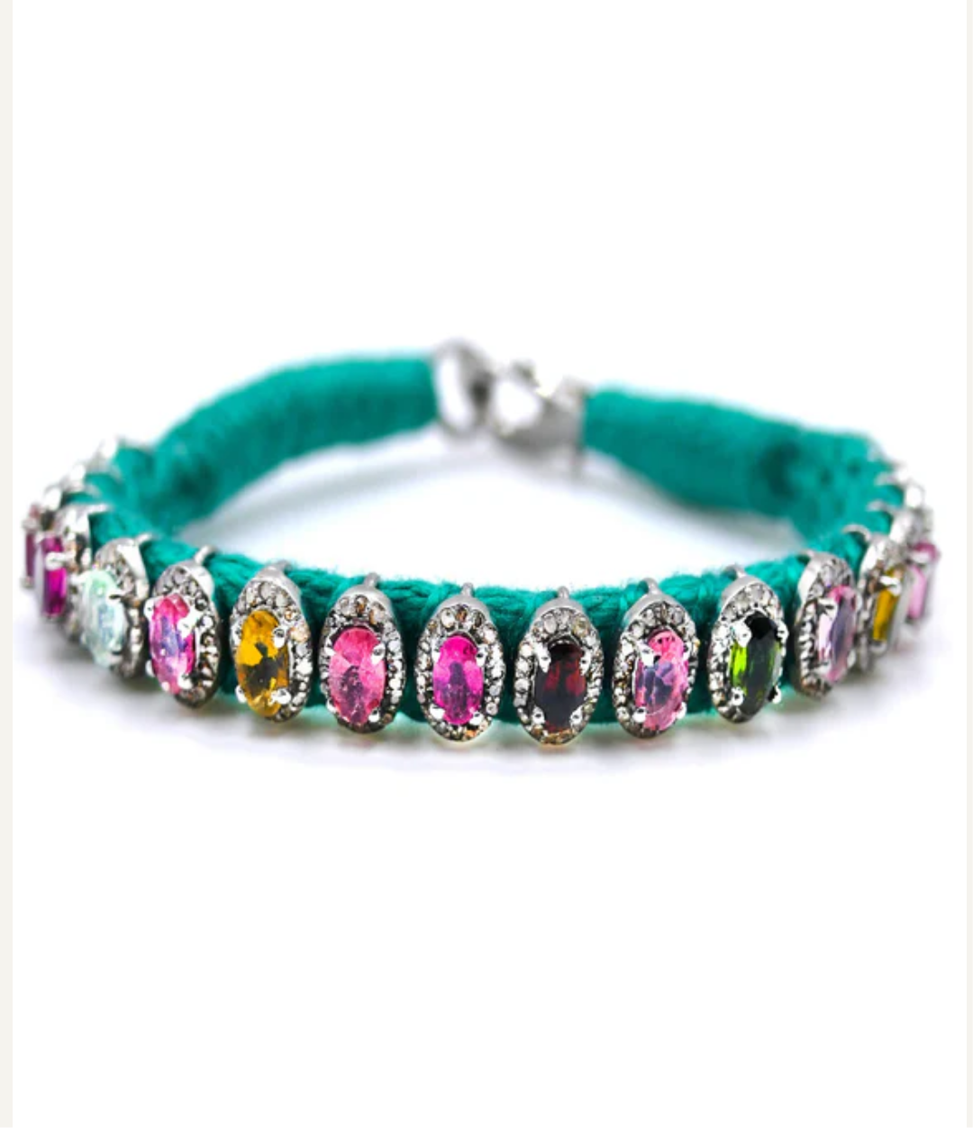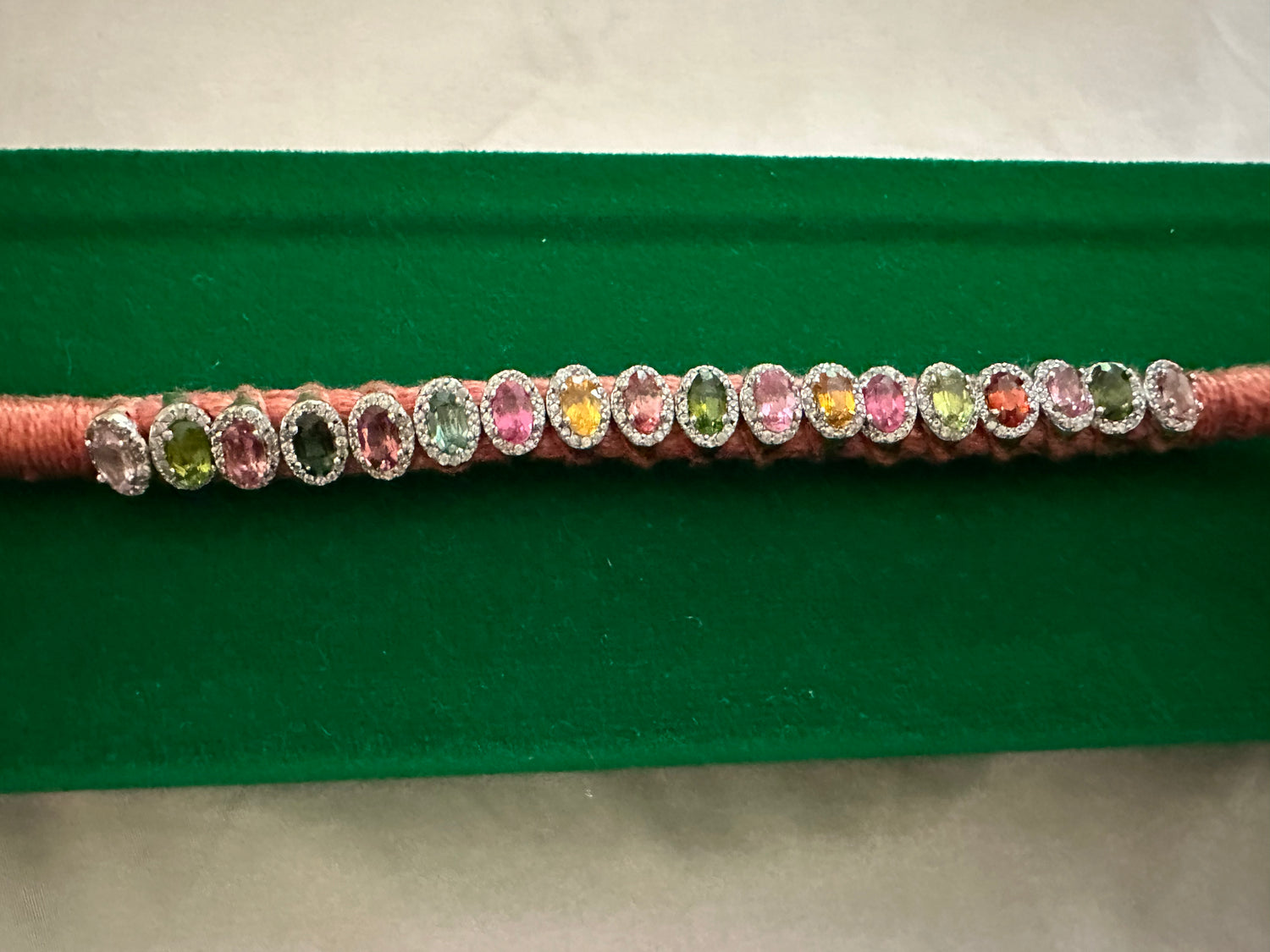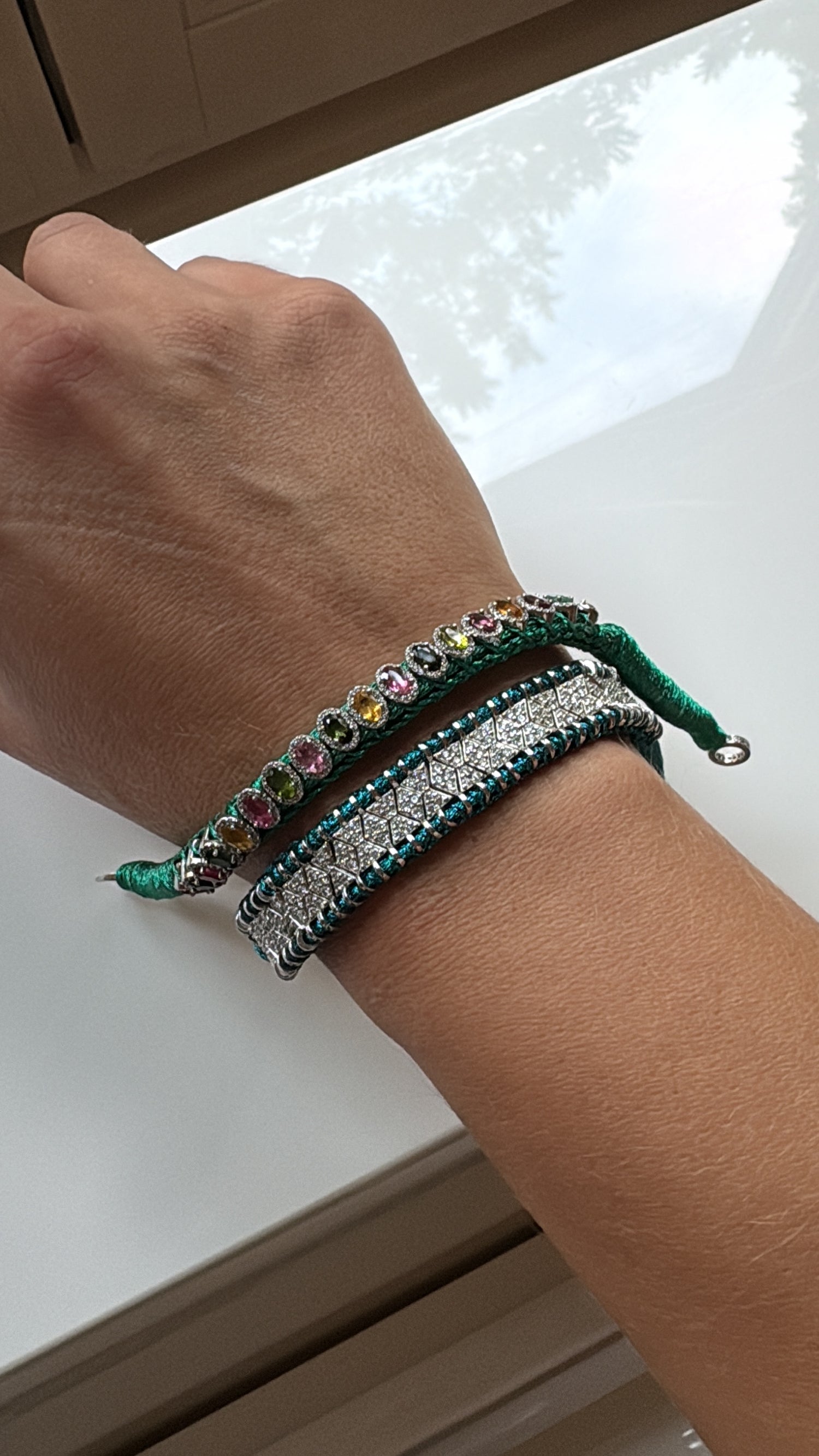 Semi precious stones and white diamonds mounted on sterling silver and silk cotton thread