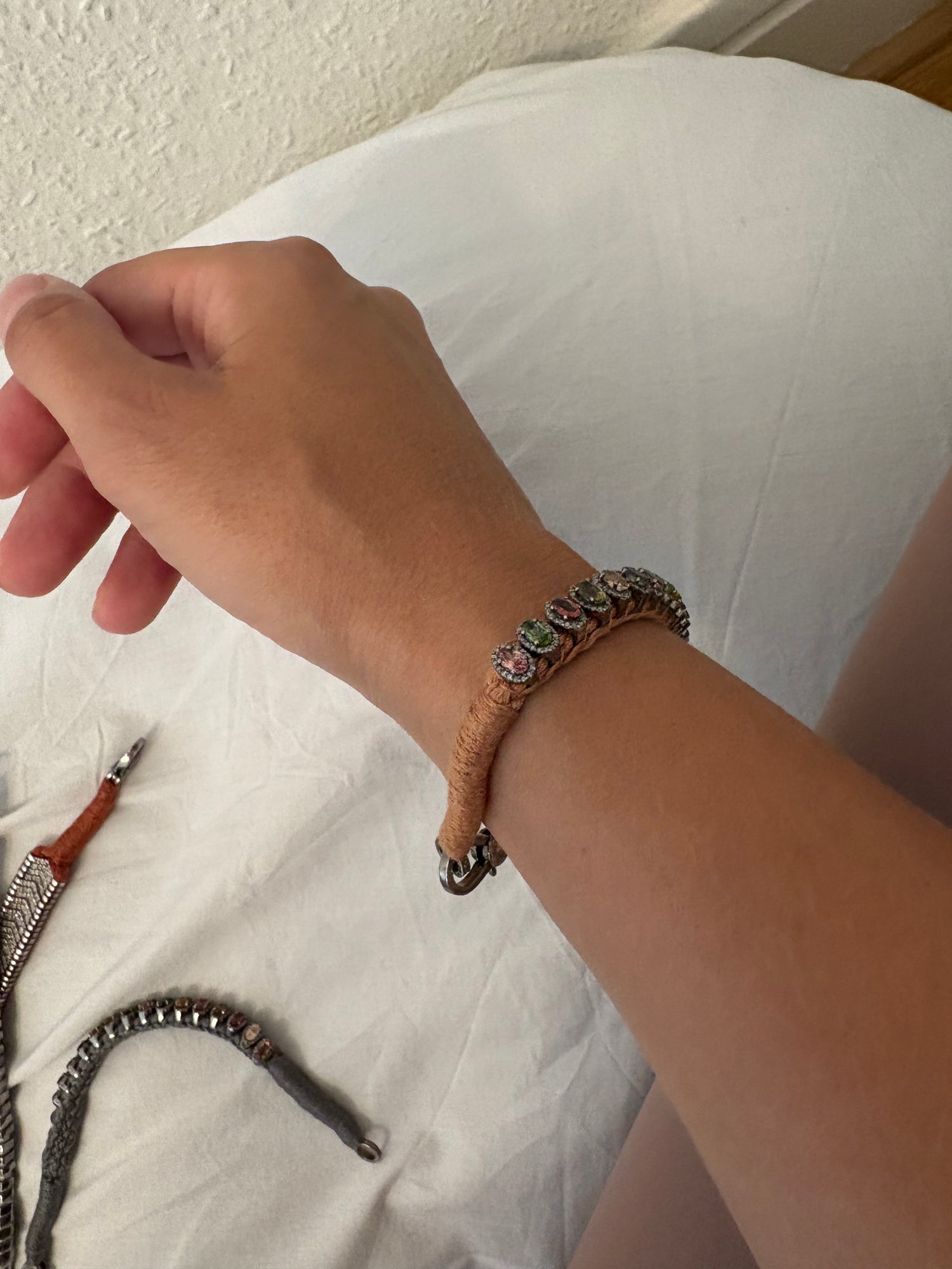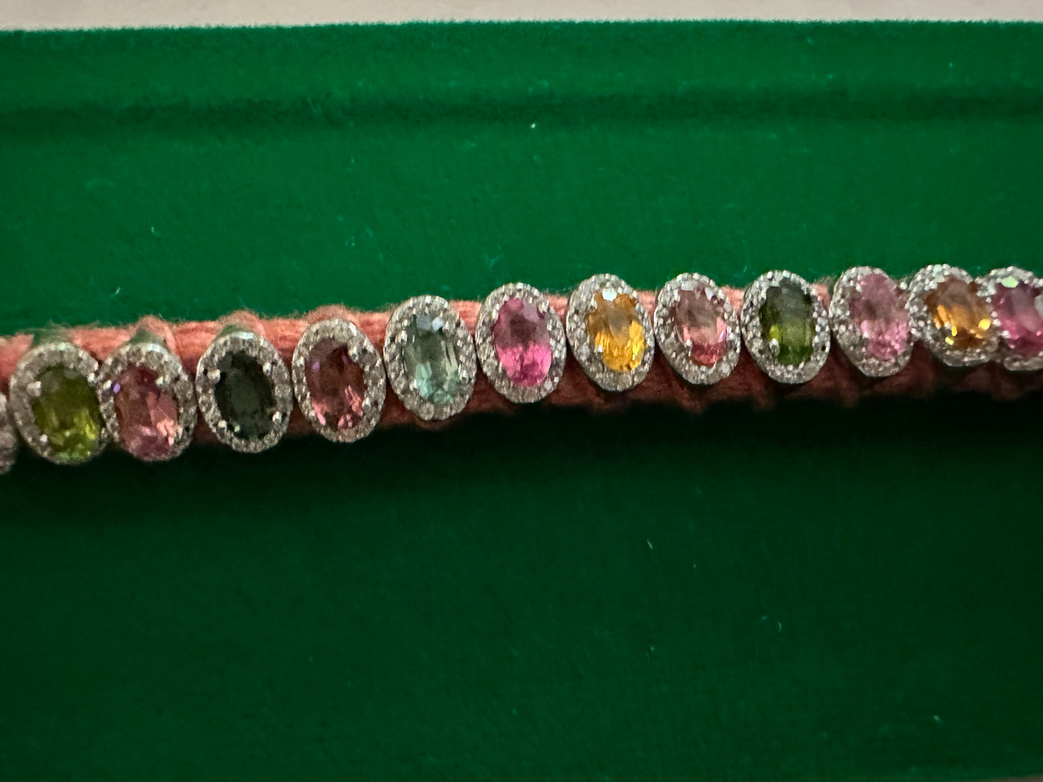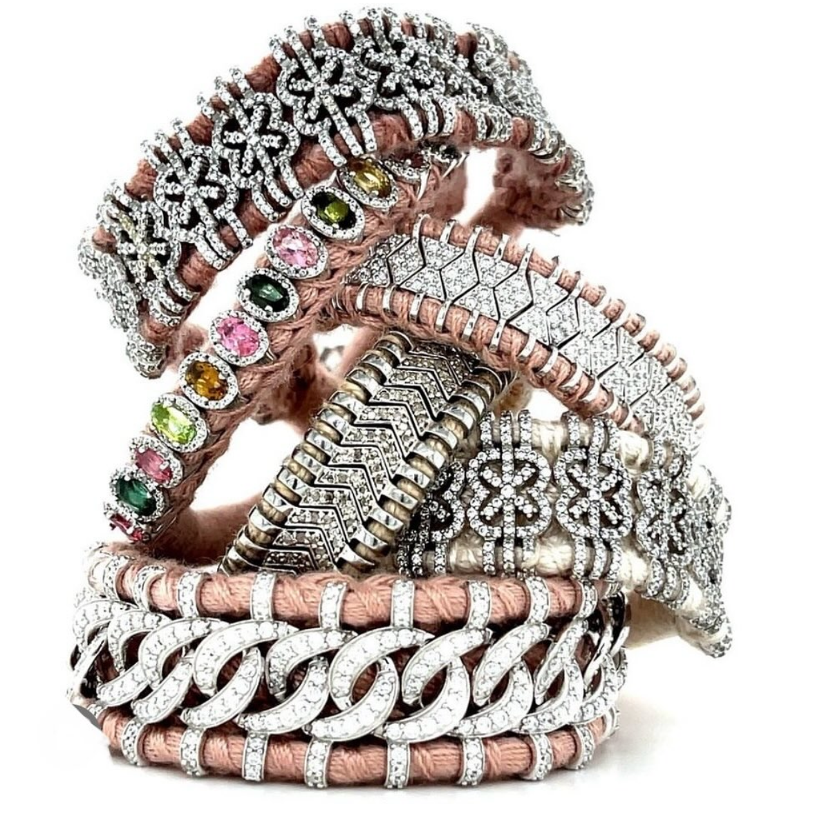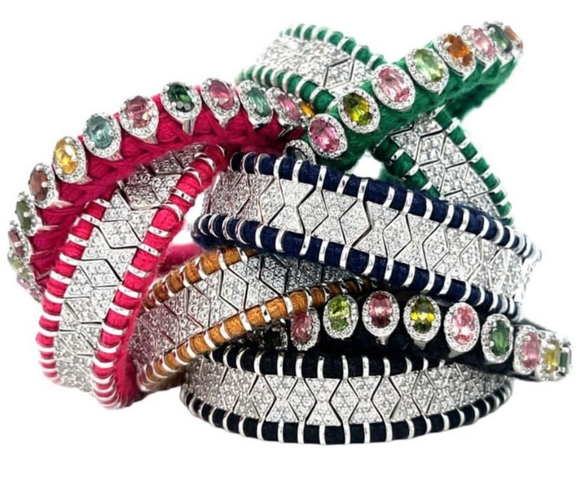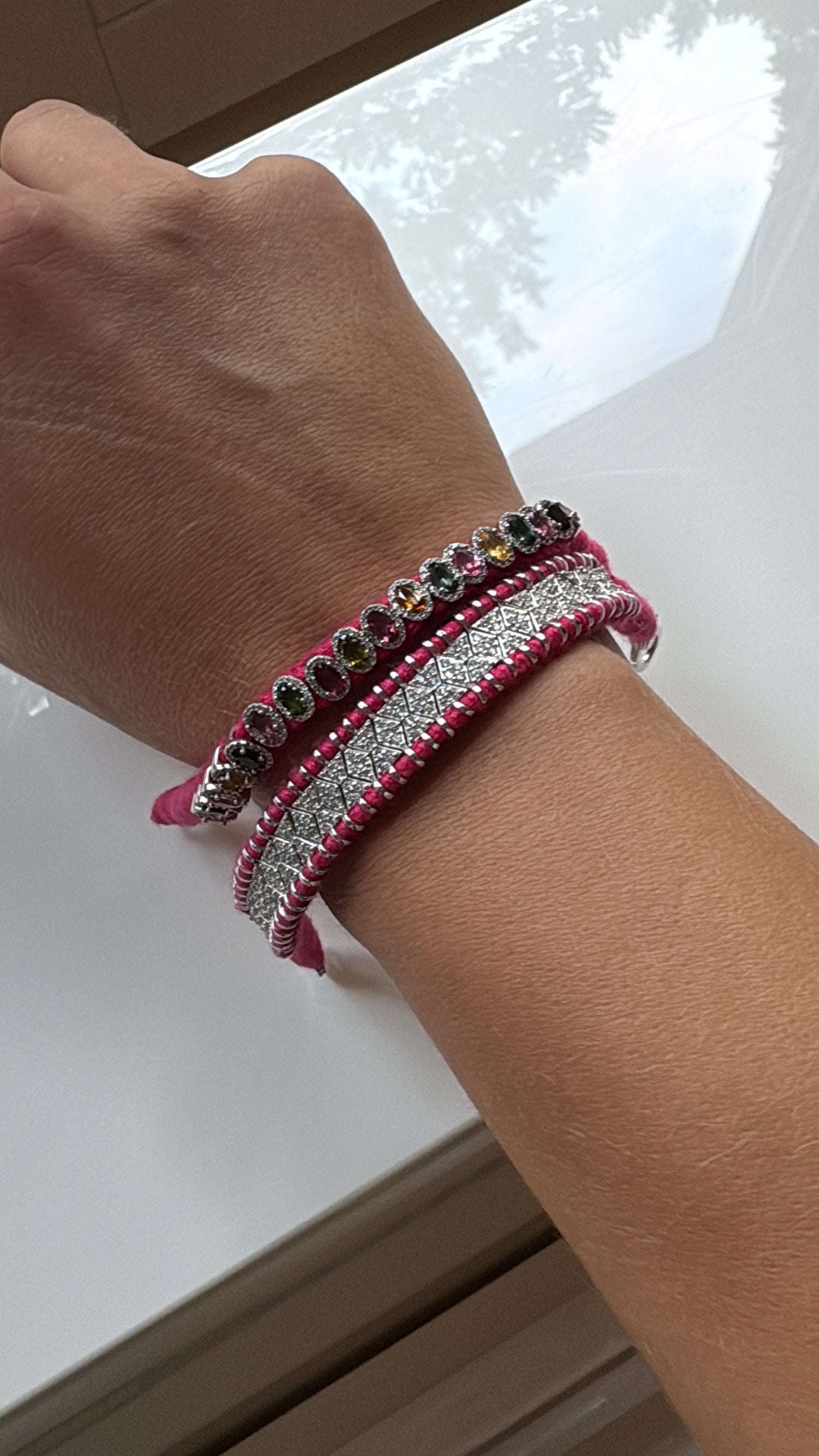 Semi precious stones and white diamonds mounted on sterling silver and silk cotton thread
