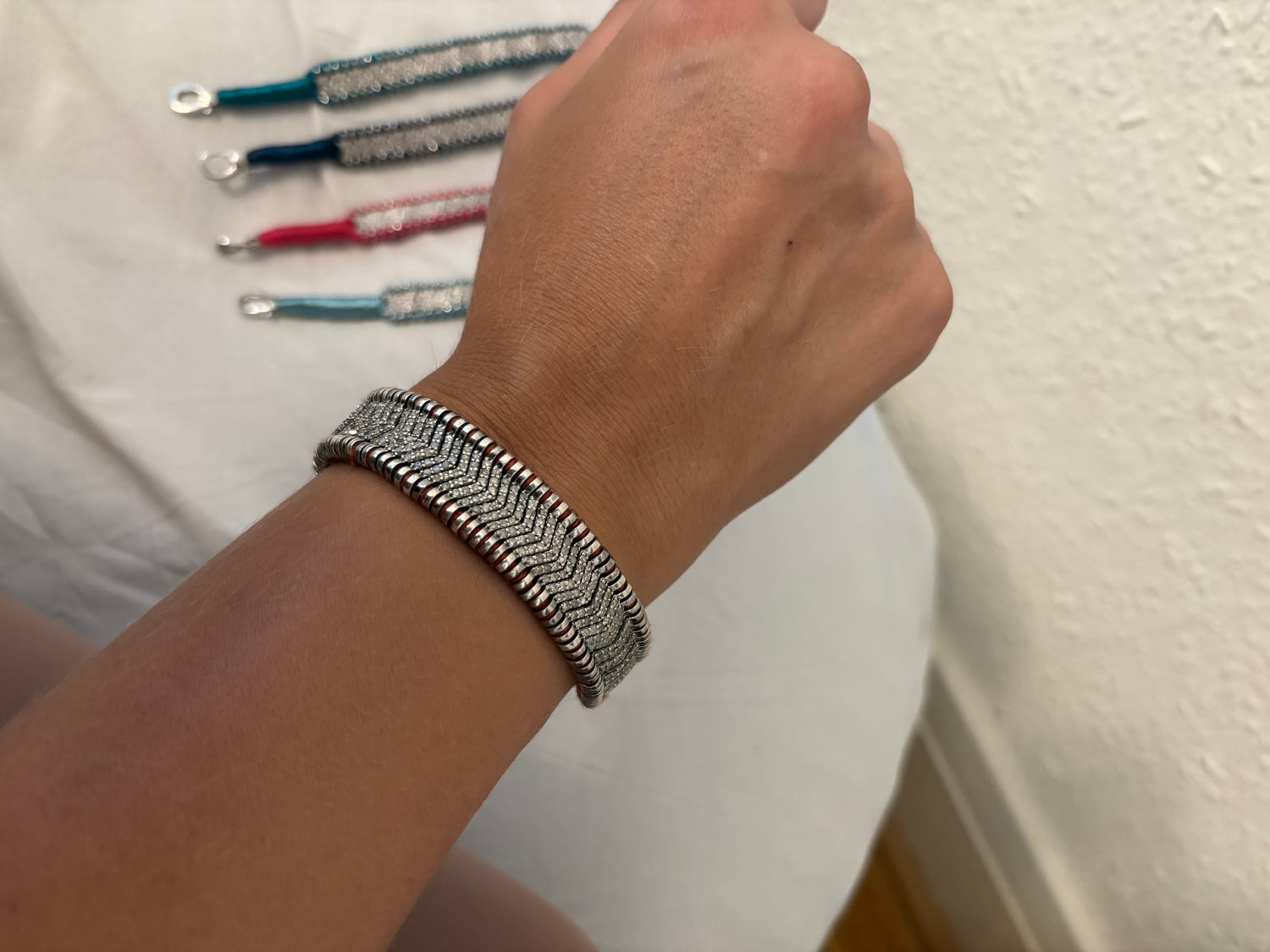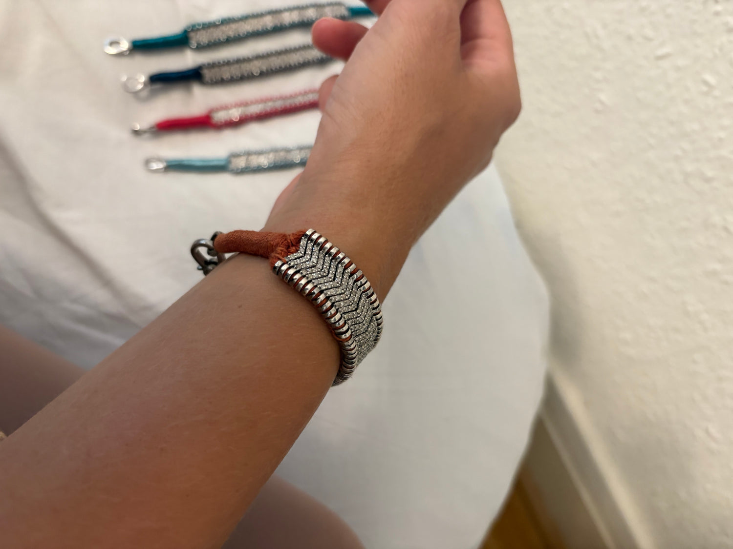 Natural diamonds in a chevron design mounted on 925 sterling silver and threaded with silk cotton in a havana colour. Size 18/19 cm